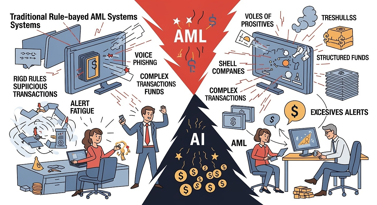 그럼에도 불구하고, 현재 많은 금융기관이 의존하는 전통적인 AML 시스템은 어쩔수 없는 한계를 내포하고 있습니다. 기존의 규칙 기반(Rule-based) 시스템은 미리 정의된 패턴과 임계값에 의존하여 의심스러운 거래를 탐지합니다. 그러나 이러한 정적인 규칙은 끊임없이 진화하는 범죄 수법에 효과적으로 대응하기 어렵다는 본질적인 문제를 안고 있습니다. 예를 들어, 보이스피싱, 대포통장, 복잡한 금융 거래, 쉘 컴퍼니, 자금 구조화 등 고도화된 범죄 유형은 기존 규칙을 쉽게 우회할 수 있습니다.